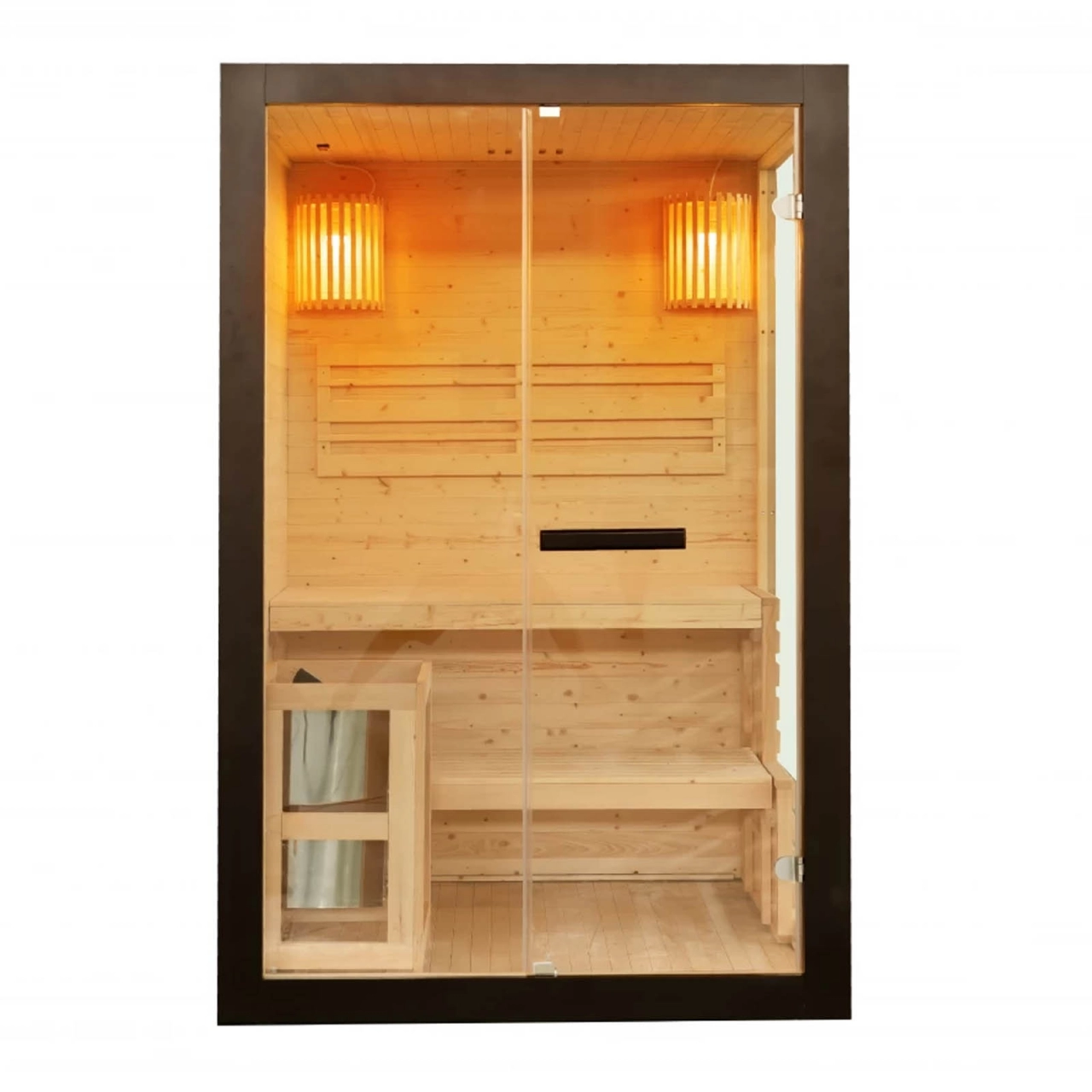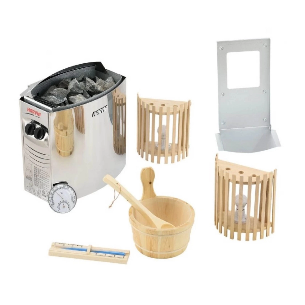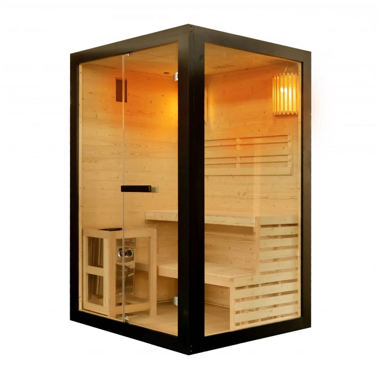 Cu un iluminat interior format din 2 lampi, aceasta sauna creeaza o atmosfera relaxanta. Este echipata cu un incalzitor Harvia, agregat pentru sauna cu piatra vulcanica si dispune de 2 banci supraetajate, spatar, maner din lemn, priza de aer pentru circulatie optima a aerului si accesorii precum Termohidrometru, găleată cu polonic, pietre sauna, clepsidra.