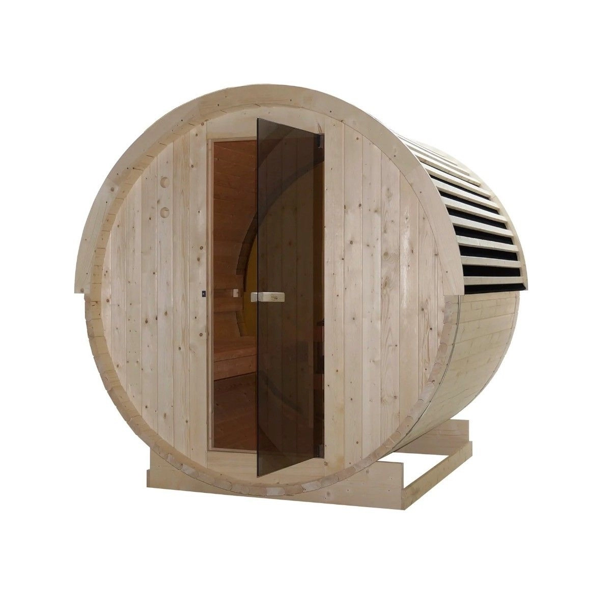 Cu dimensiuni exterioare de 195 x 205 x 195 cm si un spatiu interior generos de 177 x 189 x 177 cm, sauna poate gazdui confortabil intre 3 si 4 persoane. Structura este realizata din lemn termo-modificat de molid (TERMO-MOD), recunoscut pentru durabilitatea si rezistenta sa in conditii variate de temperatura si umiditate. Peretii au o grosime de 3.8 cm, asigurand o buna izolare termica si eficienta energetica.