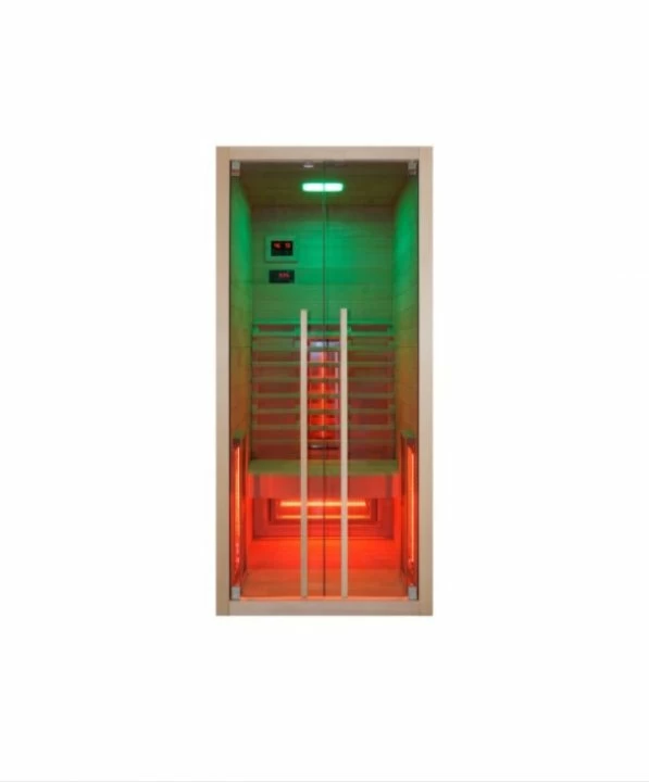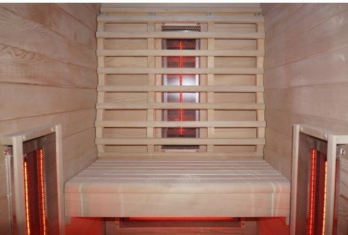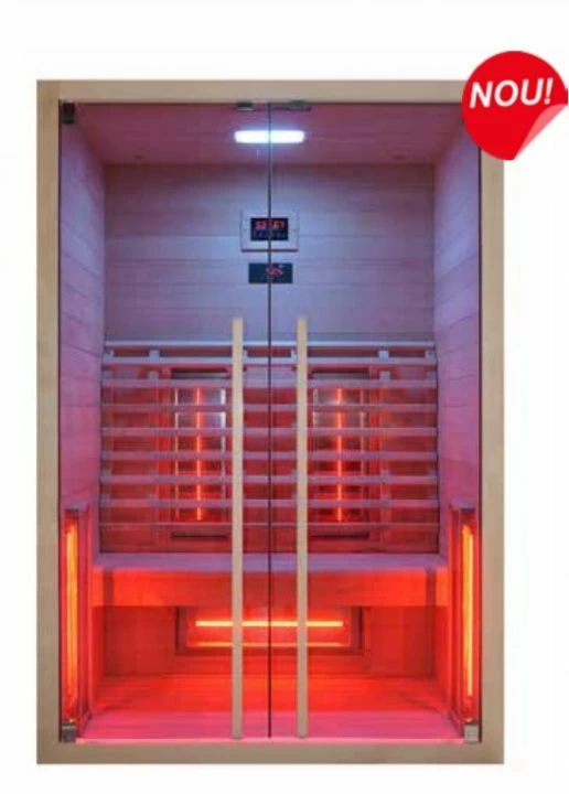 Sauna din gama Sanotechnik, colectia Ruby, este special conceputa pentru 2 persoane, este realizata din lemn de brad canadian, prezinta 5 rezistente cu infrarosu ce emana radiatii de tip B, iluminare cu LED Starlight ( cromoterapie in 7 culori) si are o putere de 2.200 Watt cu tensiunea de alimentare la 230V. Sauna este realizata din sticla securizata de 6 mm cu tenta de culoare albastru-fumuriu, are MP3 de tip C (cu Bluetooth) si un panou de comanda electronic cu 2 difuzoare si spatar ergonomic. Toate fotografiile sunt simbolice, proiectarea tehnica (dezvoltare tehnica ulterioara) se poate schimba (de exemplu, numarul incalzitoarelor, panoul de comanda si proiectarea cabinei). Cabina este proiectata pentru interior, are forma dreptunghiulara, usa este batanta, si are urmatoarele dimensiuni exterioare : 120x100xH195 cm. Dimensiunile interioare sunt 109x91xH184 cm.