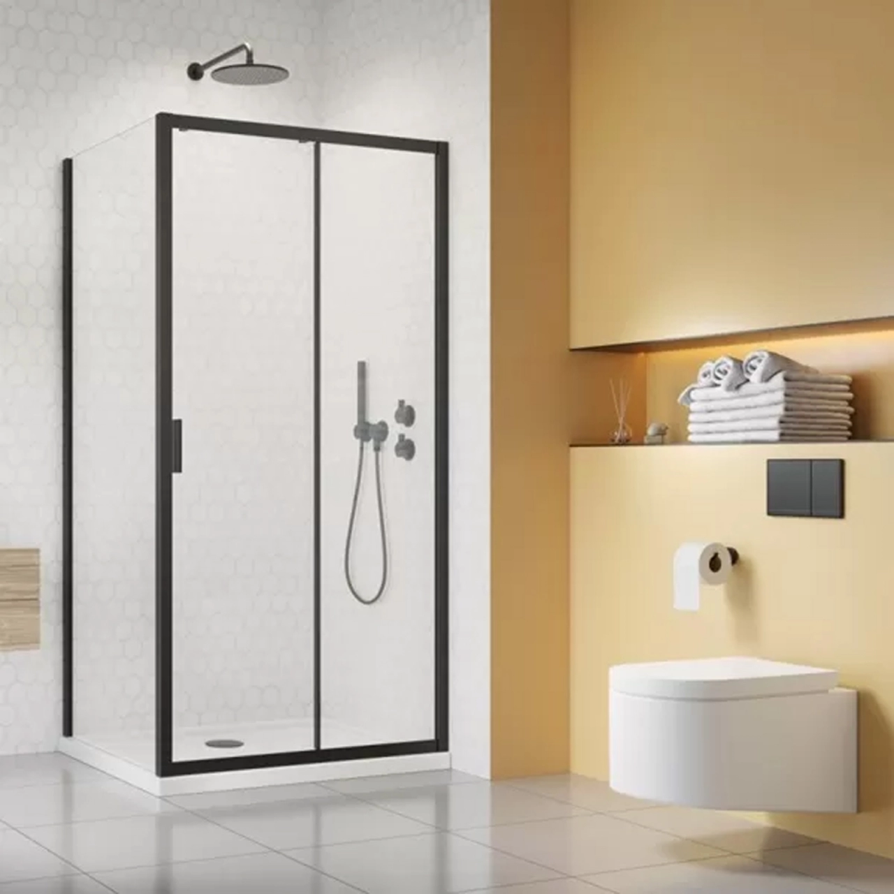 Profilele sunt realizate din aliaj de aluminiu rezistent la coroziune si permit compensarea denivelarilor peretelui. Sistemul de inchidere include banda magnetica pentru etanseitate ridicata. Sticla securizata de 5 mm, transparenta, este acoperita cu strat Easy Clean anticalcar pentru intretinere usoara.