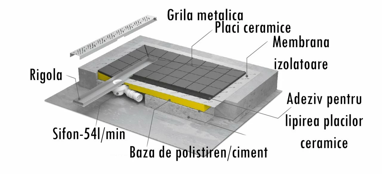 Sistemul de dus Radaway din colectia RadaDrain se instaleaza la nivelul pardoselii pe o baza de polistiren sau ciment in interiorul cabinelor de dus pentru scurgerea apei. Reprezinta o solutie tehnica moderna pentru baile unde nu se doreste instalarea unei cadite. Suprafata grilei este din otel inoxidabil avand o inclinatie potrivita pentru a asigura colectarea apei in rigola de scurgere si apoi in sifonul inclus. Placile ceramice (cu grosimea de 8-12 mm) acopera membrana hidrofuga ce impiedica infiltrarea apei. Lungimea scurgerii liniare este de 650 x 80 mm avand capacitatea de drenaj de 54 l/min. Grila rigolei poate fi aleasa dintr-o gama variata de modele: B-Basic (cod:5R055B), F-Flowers (cod:5R055F), Q-Quadro (cod:5R055Q), R-Rain (cod:5R055R), S-Steel (cod:5R055S).