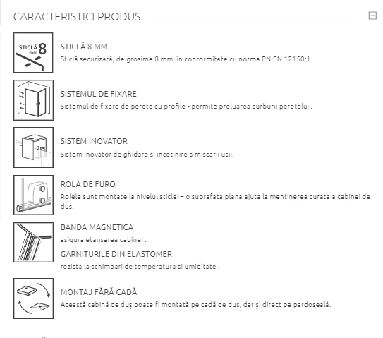 Seria Furo a producatorului polonez Radaway este caracterizata de calitatea fara precedent printre cabinele de dus cu sistem de glisare. Prin renuntarea la ghidajul din partea superioara si asezarea usii pe role in partea de jos, a obtinut o cabina de o eleganta, luminozitate si transparenta extraordinara. Rolele sunt montate la nivelul sticlei la interior, facand astfel mai usoara curatarea cabinei. Usa gliseaza prin fata partii fixe, oferindu-ne astfel o intrare spatioasa si confortabila. Sticla securizata a carei grosime este de 8 mm, este transparenta, in conformitate cu norma PN:EN 12150:1. Deoarece nu intotdeauna peretele este perfect drept, sistemul de fixare de perete cu profile al acestei cabine, permite preluarea curburii peretelui prin reglaj cuprins intre 1490-1508 mm. Sistemul de ghidare si incetinire a miscarii usii este unul inovator, rolele fiind montate la nivelul sticlei, ceea ce face ca suprafata plana sa ajute la mentinerea curata a cabinei de dus. Banda magnetica asigura inchiderea perfect etansa a cabinei, impiedicand iesirea apei in aceasta, iar garniturile fabricate din material elastomer rezista la schimbari de temperatura si umiditate. Montajul se poate realiza atat pe cadita (vezi sectiunea "produse complementare") cat si direct pe pardoseala.